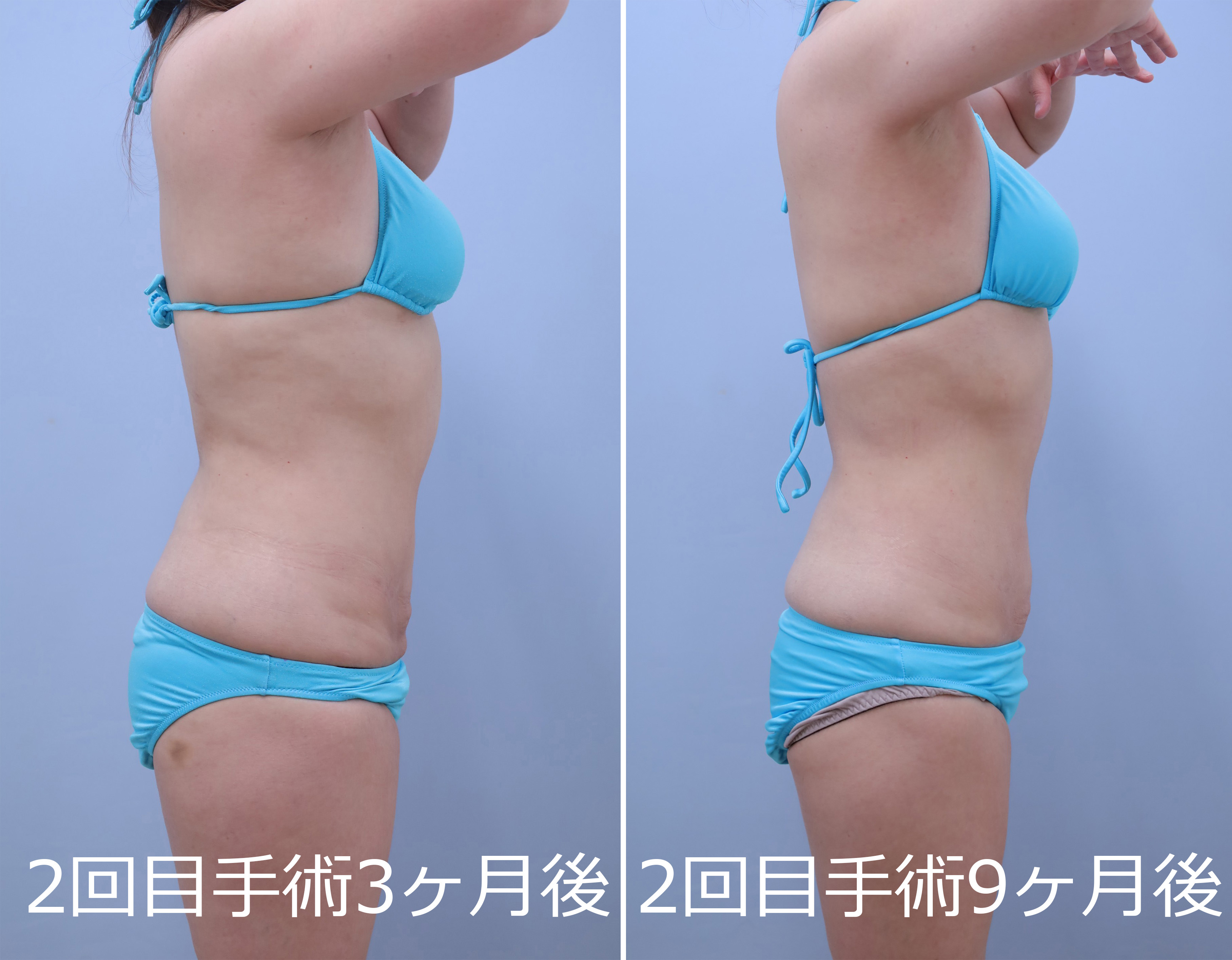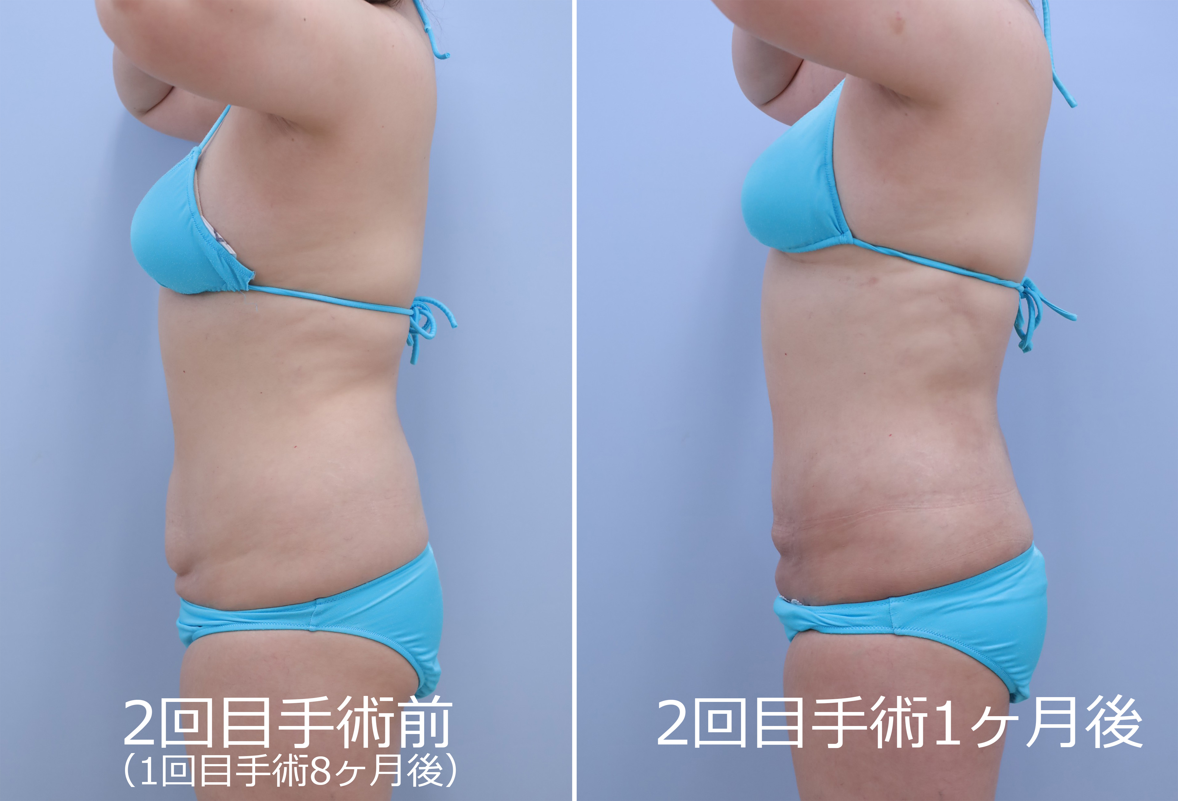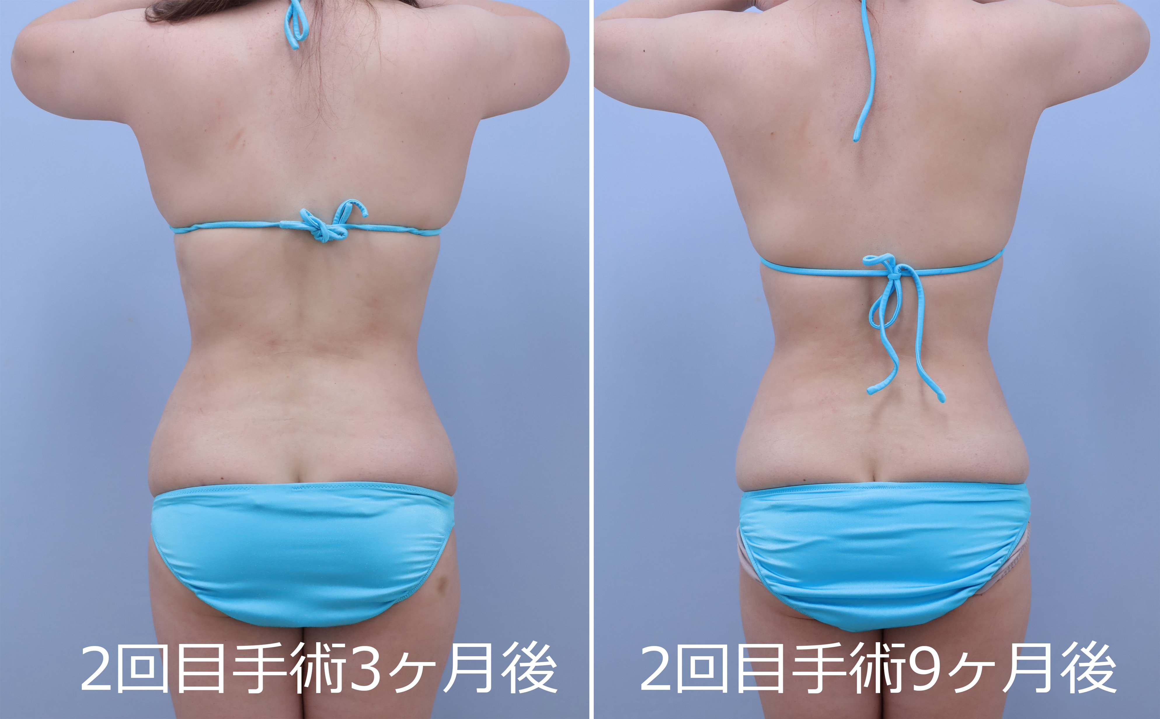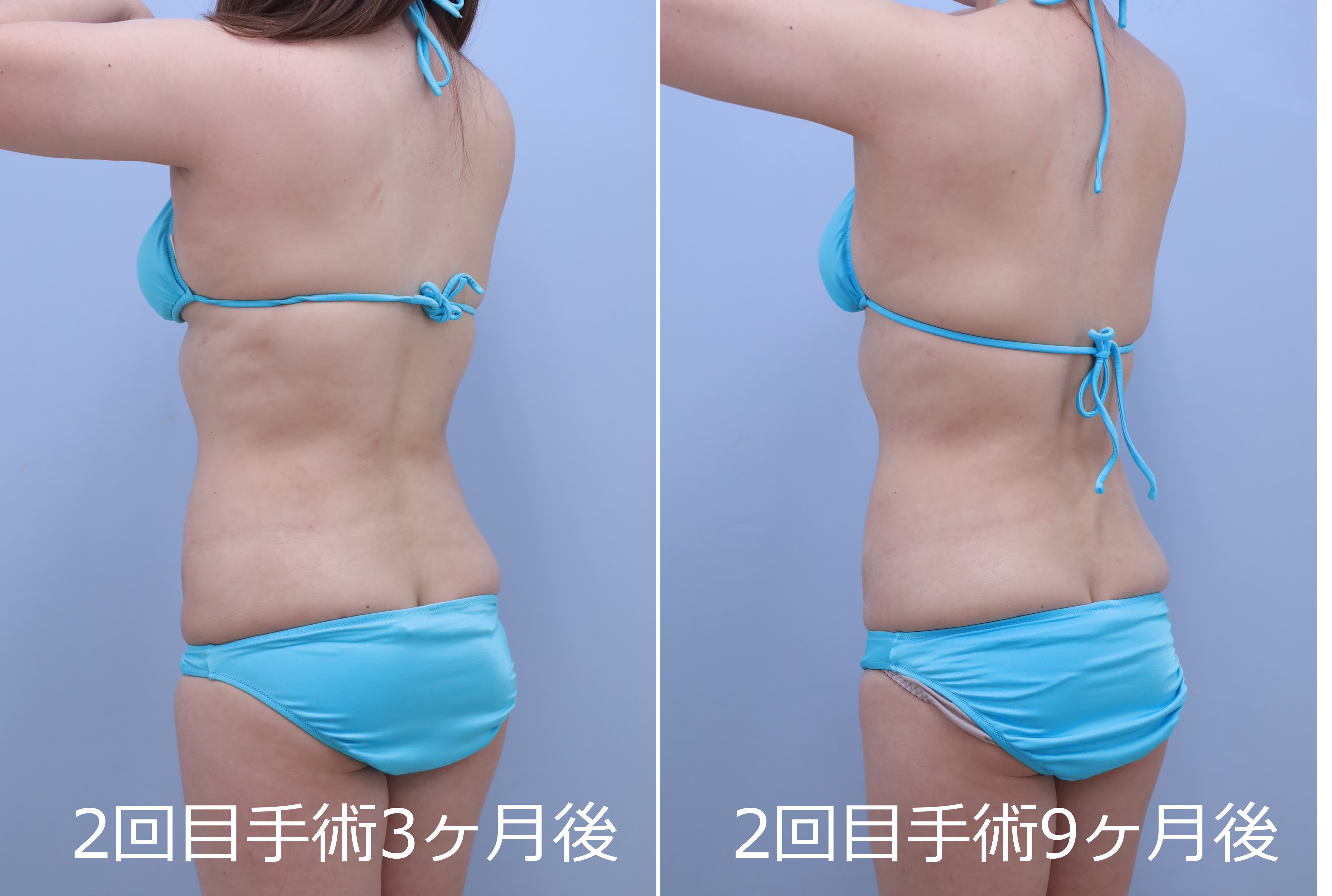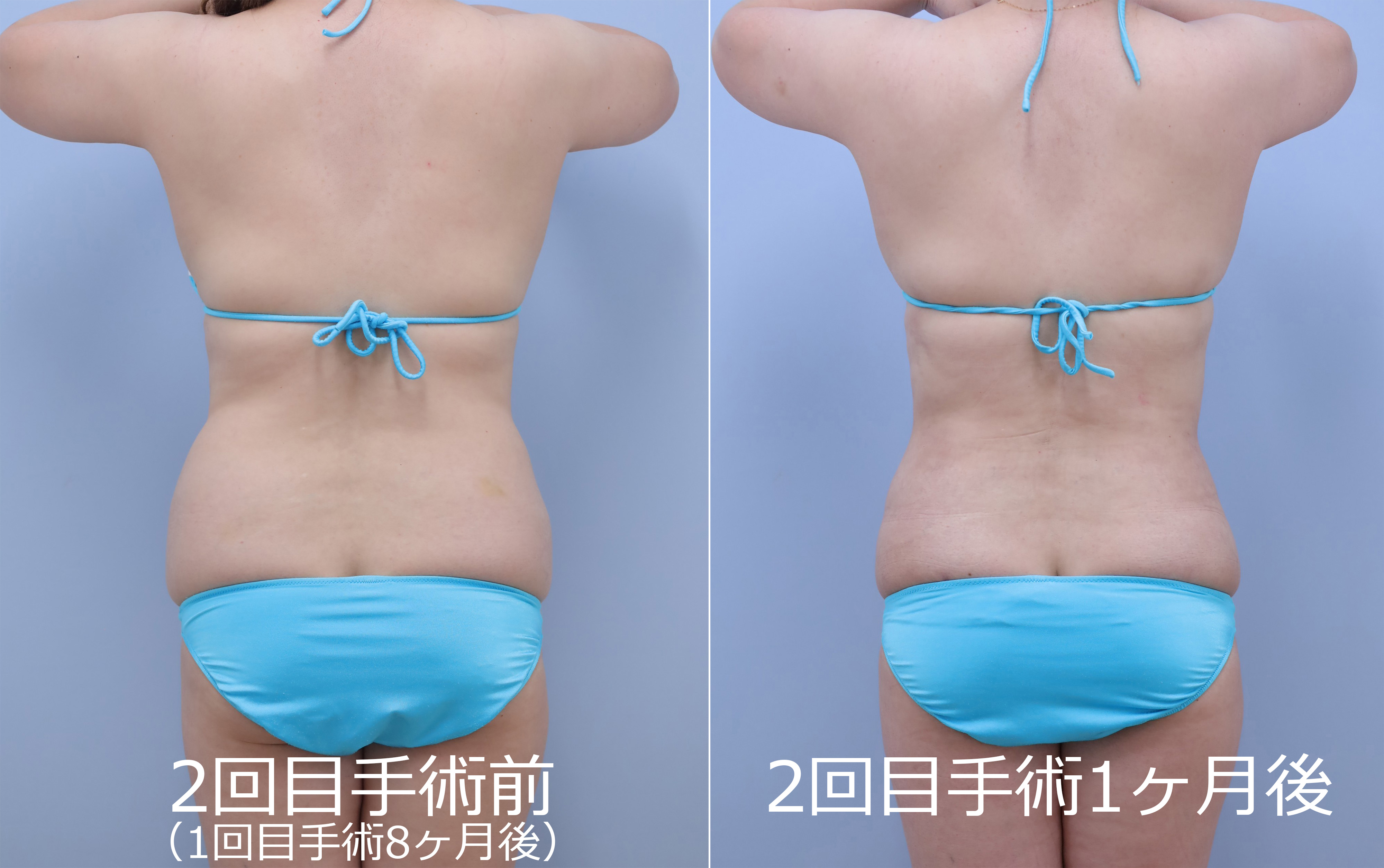 2回目:1回目の皮膚の締まり具合を最低半年間経過を見てから、後面+前面(1回目で手加減している浅い層を含め全層的にもう一回)の吸引