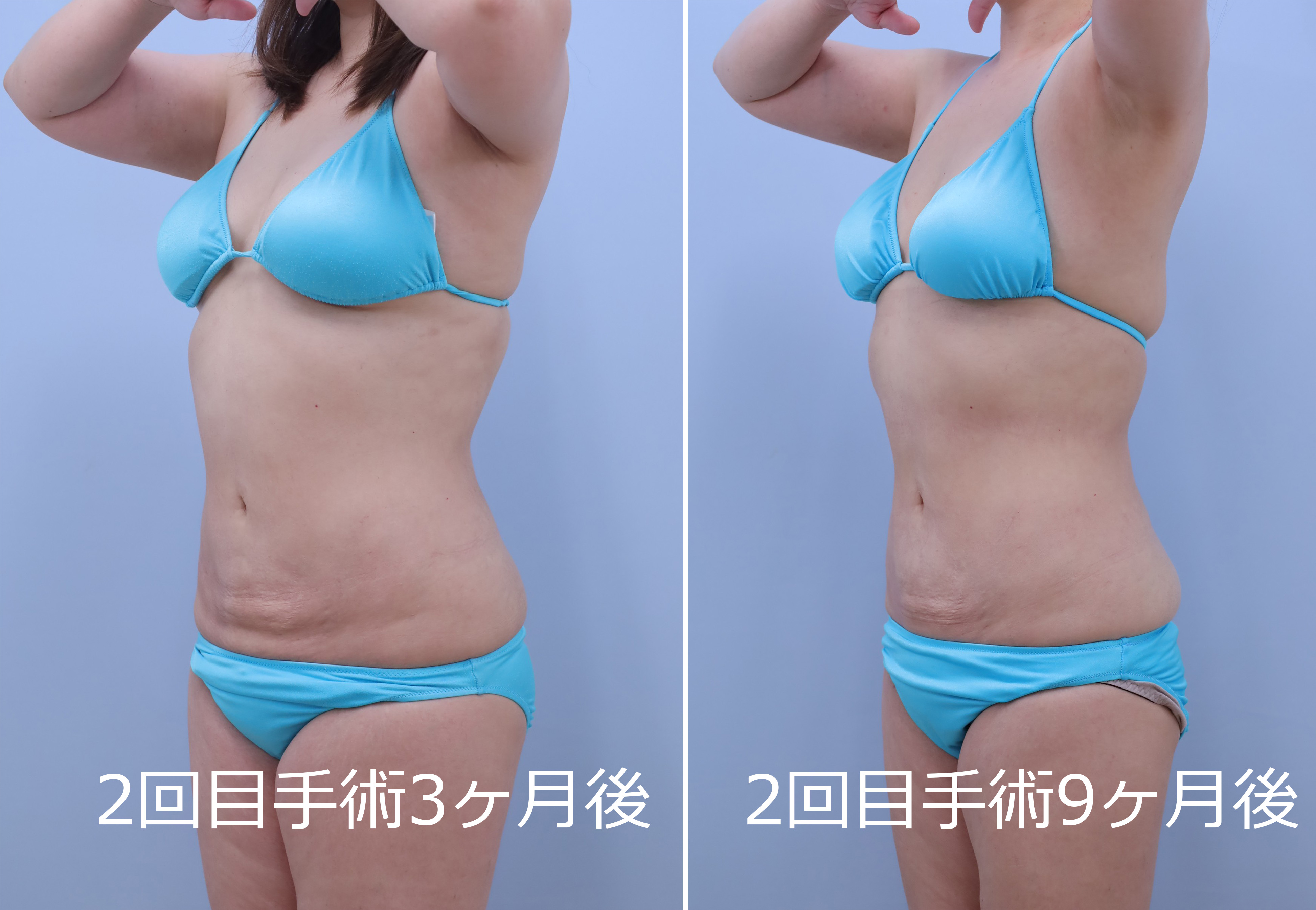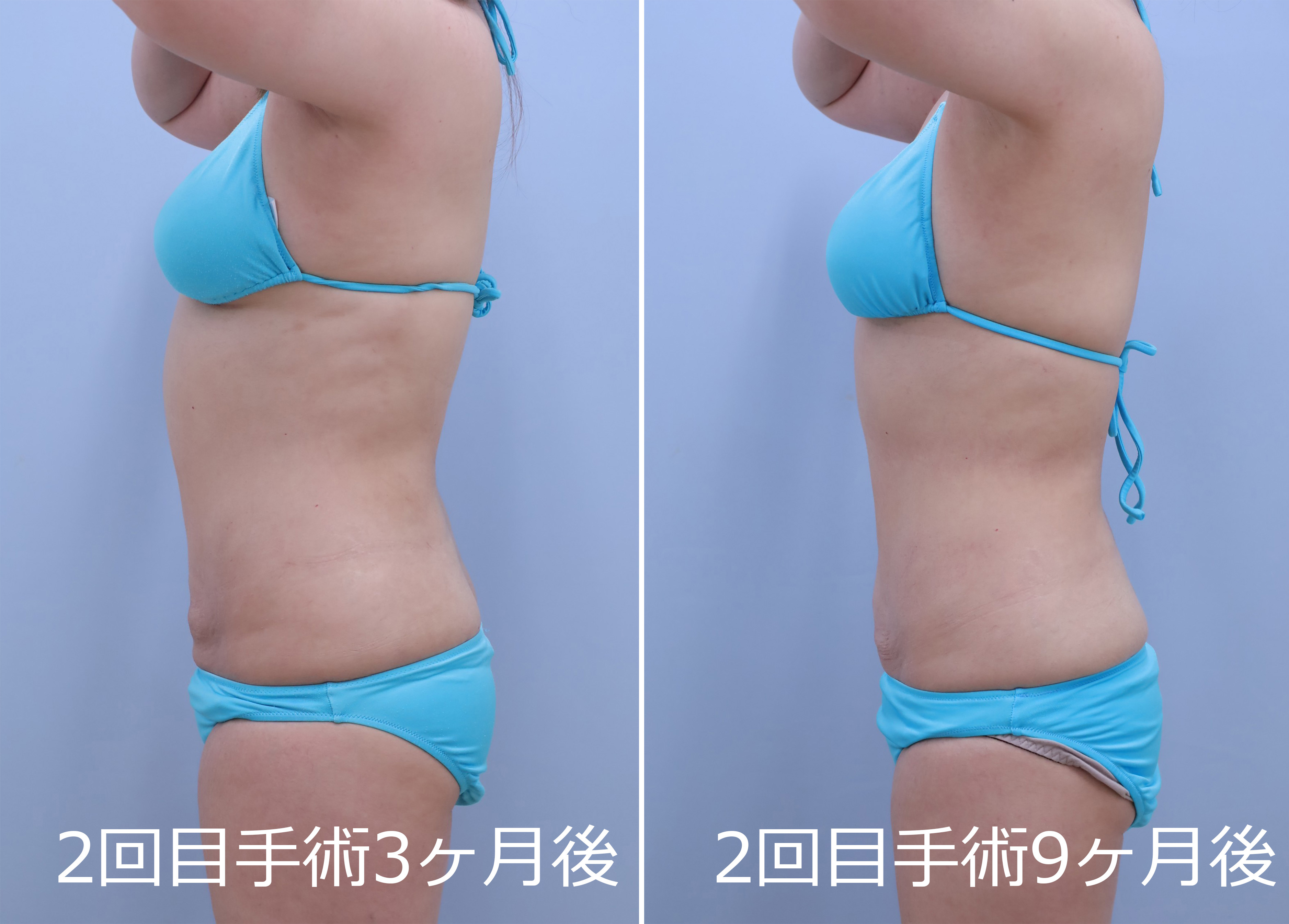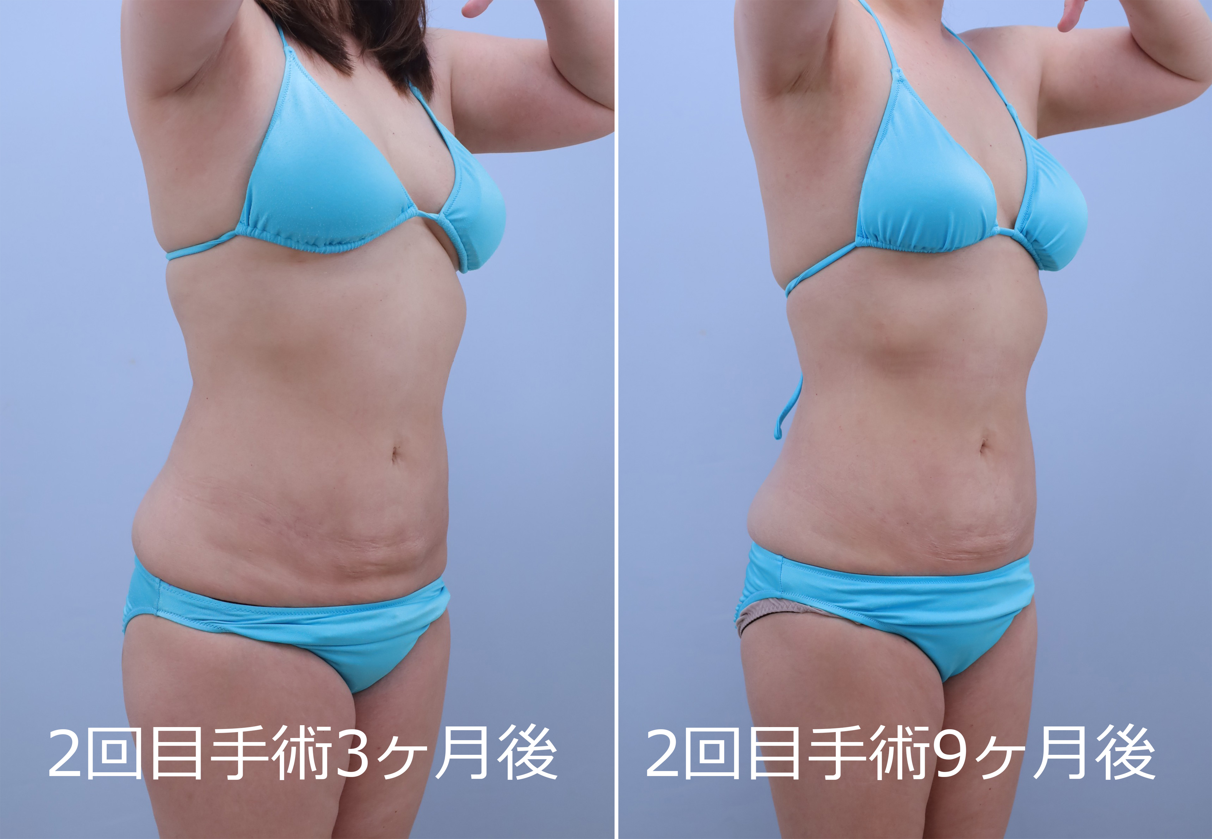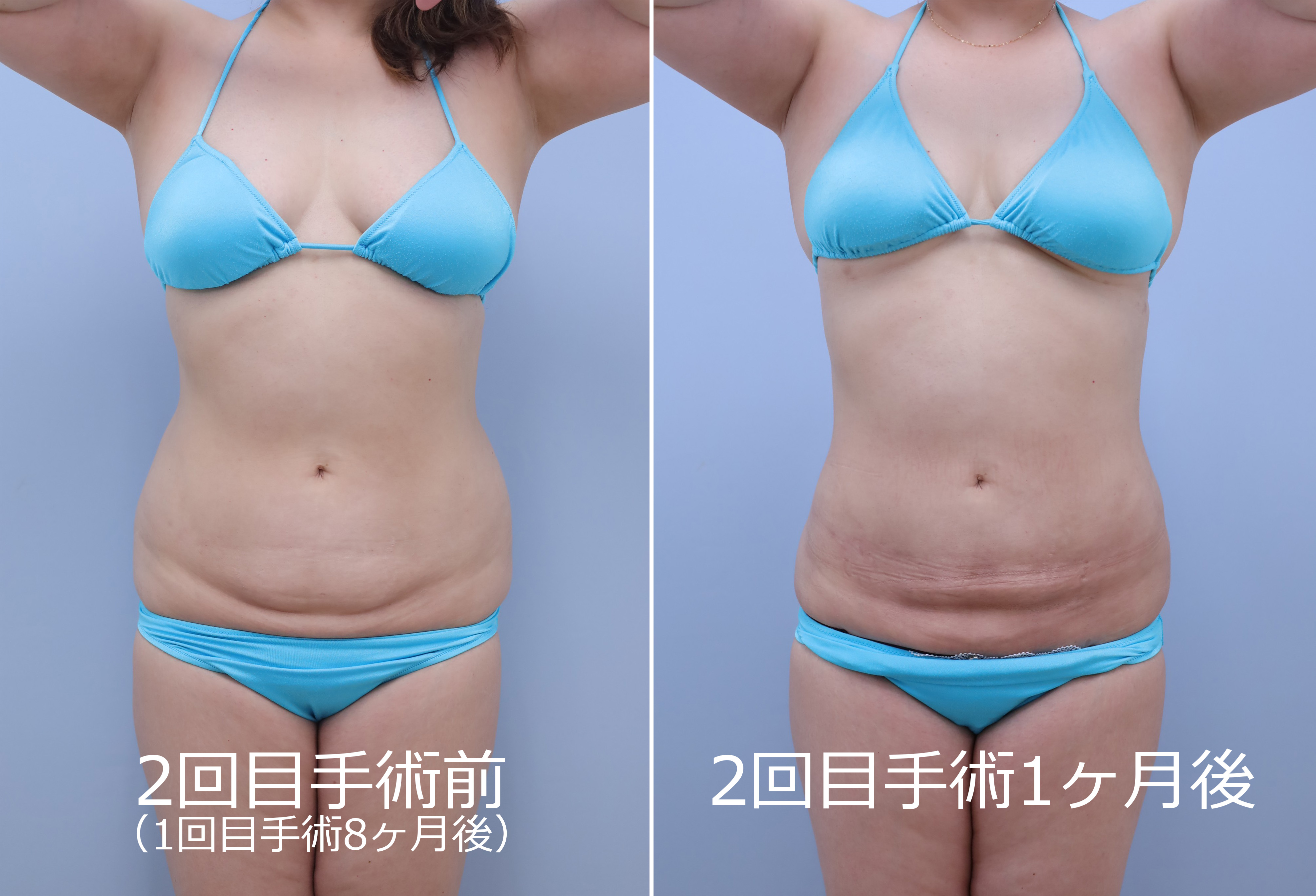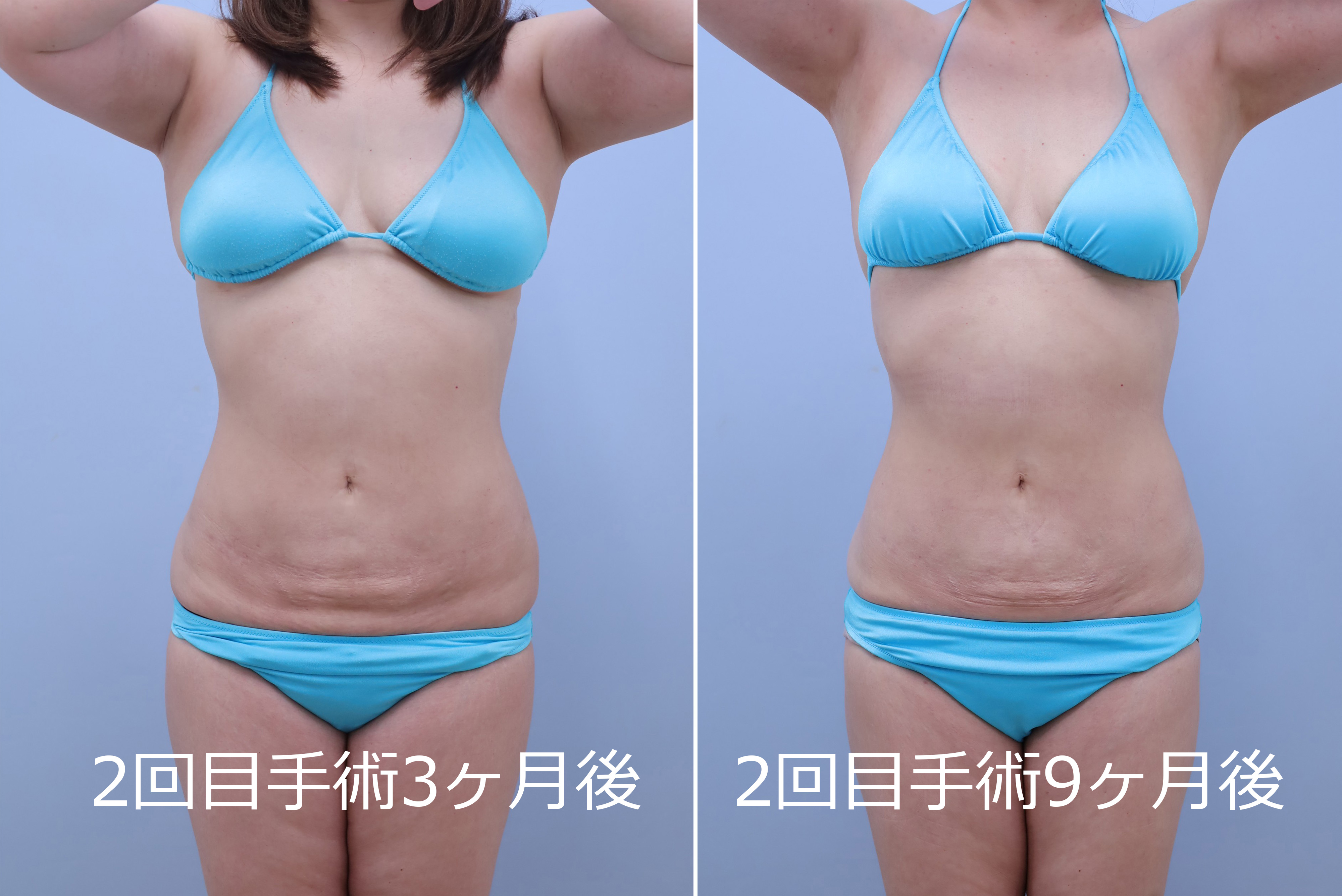 2回目:1回目の皮膚の締まり具合を最低半年間経過を見てから、後面+前面(1回目で手加減している浅い層を含め全層的にもう一回)の吸引